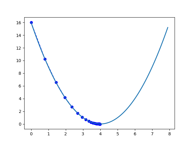 有了这个概念再看公式1,可以发现通过r,能够根据y的变化率进行推进,从而逐渐逼近最小值的点。具体过程如下代码所示: