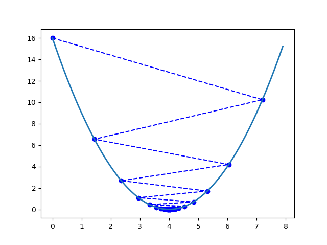 如果,我们选择比较大的步长,比如0.9,那么会导致步长过长,“跨”过最小值,同样可以收敛,得到以下图像。